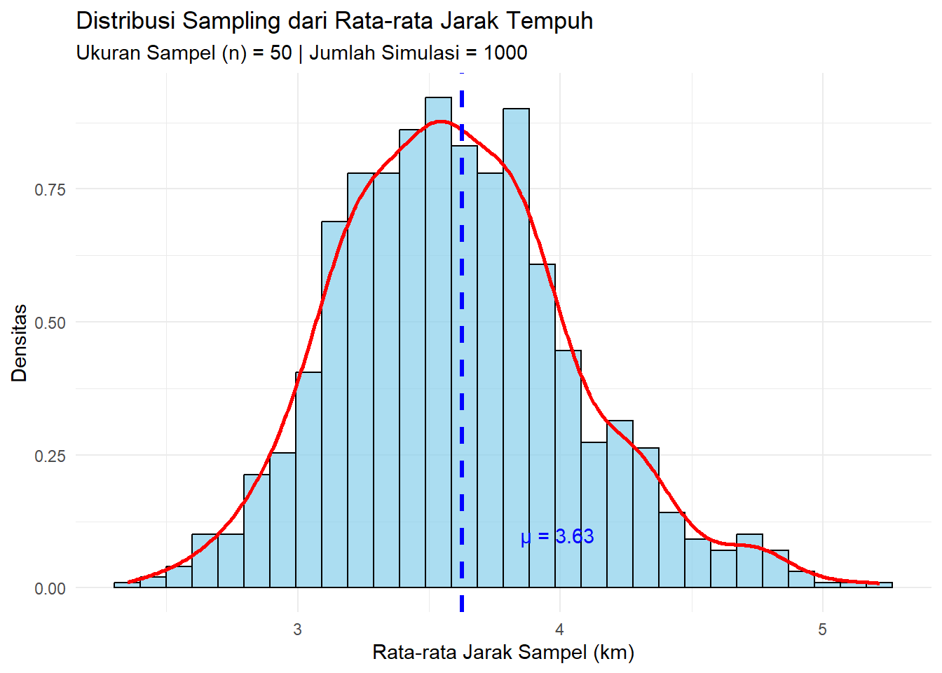 paste("Rata-rata Jarak Populasi (μ):", round(pop_mean, 2), "km")## [1] "Rata-rata Jarak Populasi (μ): 3.63 km"